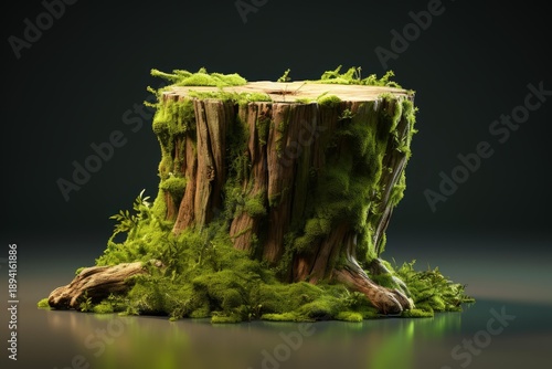 © nsit0108, Fototapeta premium Tree stump covered in vibrant green moss against a dark background, providing a natural platform