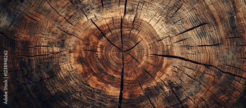 © ArtificialHorizons, Fototapeta premium Tree stump cross-section with detailed growth rings and texture visible on wood surface. Copy Space for text placement.