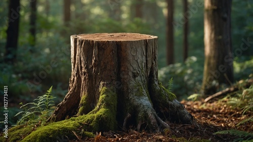 Fototapeta premium Tree stump pedestal in lush forest setting
