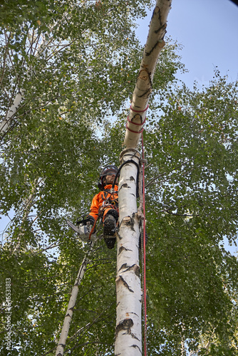 © poto8313, Fototapeta premium Tree surgeon. A man removes a birch tree