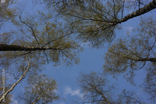 © Валентина Кваскова, Obraz premium Tree tops against blue sky in spring