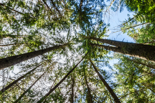 © olegmayorov, Fototapeta premium Tree tops are illuminated by the spring sun against sky