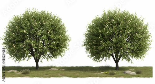 © Jenjira, Fototapeta premium tree, trees, green tree, Two Lush Green Trees with Pink Blossoms in a Grassy Meadow