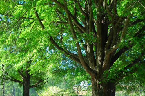 © nd700, Fototapeta premium tree trunk and green tree branches in urban area