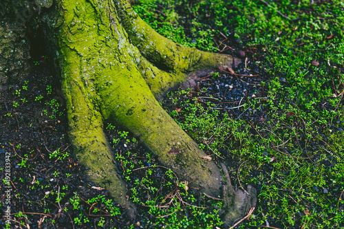 Fototapeta premium tree trunk and roots covered in intensively green moss