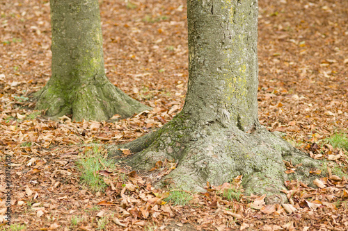 Obraz premium Tree trunk bases with fallen leaves in Fall
