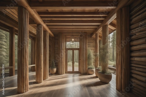 Obraz premium Tree trunk columns in rustic interior design of modern entrance hall with door