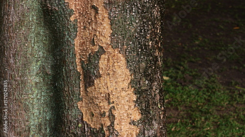 © WAHYU, Obraz premium Tree trunk damage showing extensive bark beetle infestation.