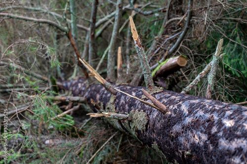 Obraz premium Tree trunk infested with bark beetle. Tree trunk eaten by forest parasite.