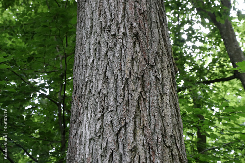 © leomalsam, Obraz premium Tree trunk on a green forest background