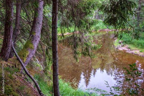 © Martins Vanags, Fototapeta premium tree trunk silhouettes on the shore of the river