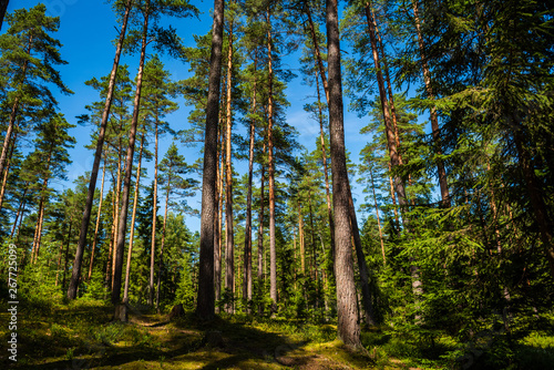 © Martins Vanags, Obraz premium tree trunk wall in pine tree forest with green moss covered forest bed