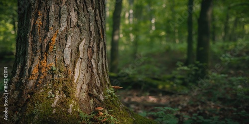 © Rizvan, Obraz premium Tree trunk with lichen on bark, natural growth and ecological balance, Earth Day