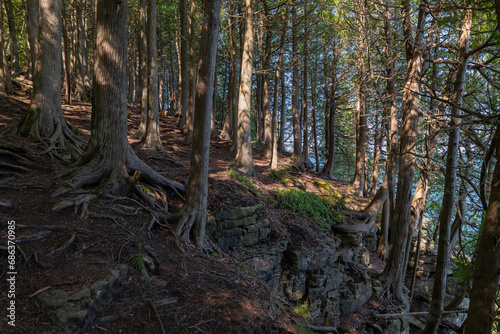 © scandamerican, Naklejka premium Tree trunks and roots that are exposed and gnarly in a lakeside park forest in an eery landscape scene.