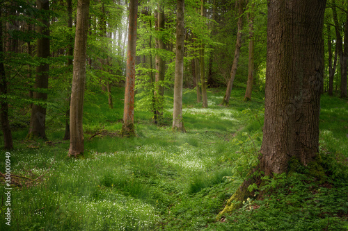 © Maren Winter, Obraz premium Tree trunks in a mixed coniferous forest with white flowering ground cover plants and sunlight from behind, copy space
