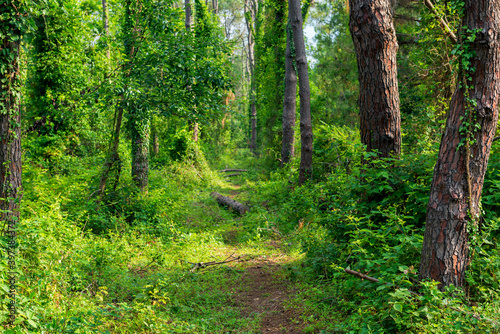 Obraz premium Tree trunks in a mixed forest covered with ivy