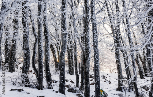 Obraz premium Tree trunks in a snow-covered forest