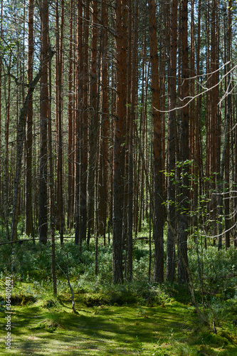 © Mikhail, Fototapeta premium tree trunks in sunny summer forest with shadows and sun rays in background