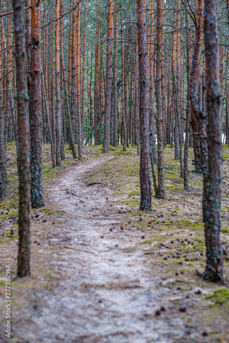 © Martins Vanags, Fototapeta premium tree trunks on a dark green blur background in forest in summer