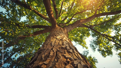 © Vladimir, Naklejka premium Tree view from below. Closeup tree trunk with bark and branches with leaves. An unusual perspective on the forest and nature