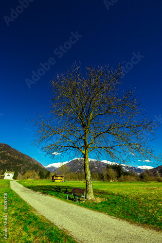 © zakaz86, Obraz premium tree with a bench between the mountains