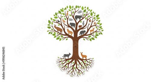 © Adobe, Obraz premium Tree with animals in branches and roots on white background
