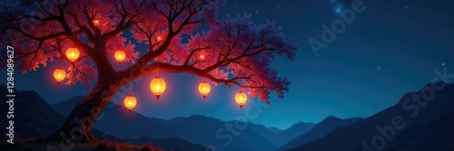 © Kingphet, Obraz premium Tree with glowing lanterns hanging from branches, night, lights, stars
