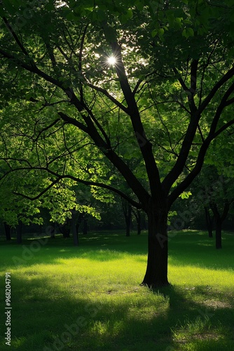Obraz premium Tree with green leaves in a serene park, sunlight filtering through the...