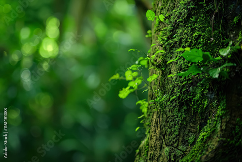 Obraz premium Tree with green moss and leaves is the main focus of the image.