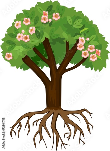 Naklejka premium Tree with pink flowers and green leaves on white background