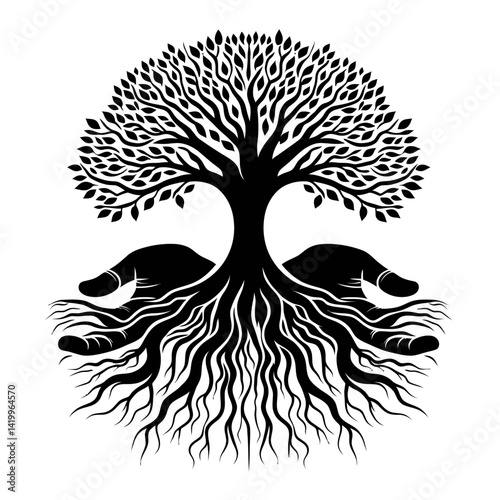 © Alam, Obraz premium Tree with roots shaped like hands silhouette black color logo on white background