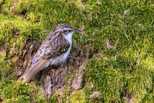Fototapeta premium Treecreeper sitting on a mossy tree trunk