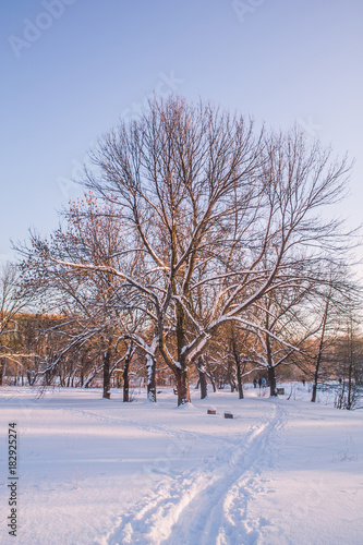 Fototapeta premium Trees alley at winter sunset