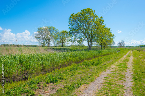 Fototapeta premium Trees along a field below a blue sky in sunlight in spring