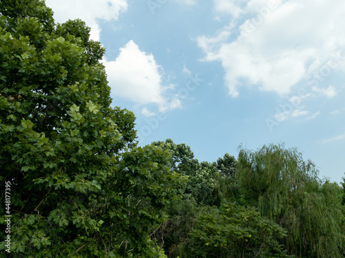 Obraz premium trees and clear blue sky with white clouds