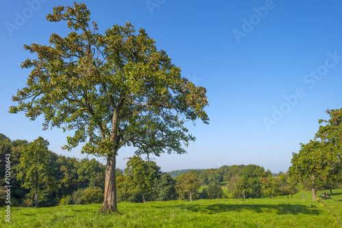 Fototapeta premium Trees and cows in a meadow in summer