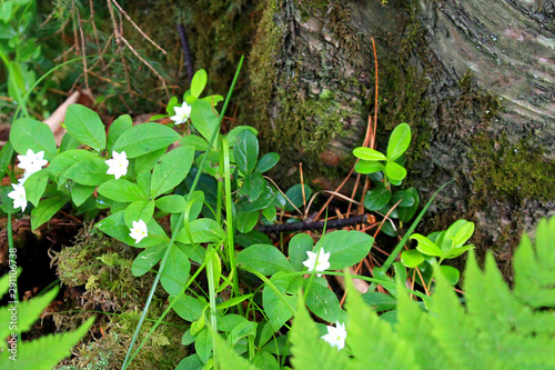 Fototapeta premium trees and white flowers in the summer forest