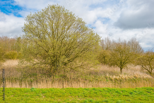 © Naj, Obraz premium Trees below a blue cloudy sky in spring