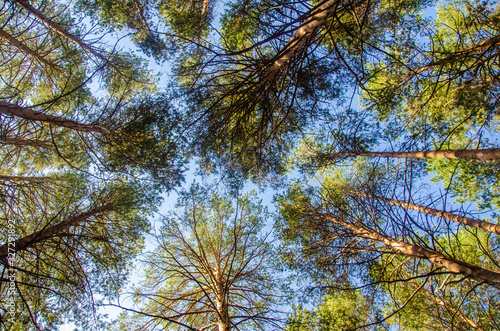 Obraz premium Trees bottom view up birch fishe sky background branches without leaves...