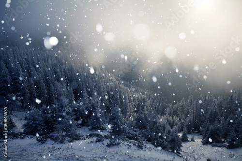 © erika8213, Obraz premium Trees covered with hoarfrost and snow in winter mountains - Christmas snowy backgroundic holiday background