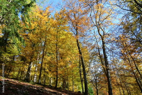 © Serhii, Fototapeta premium Trees covered with yellow and orange leaves grow on the hillside in the autumn forest. Hiking in nature. Tourist natural landscape and walking route