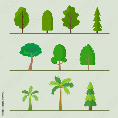 Fototapeta premium Trees flat vector set.Plants element collection.Tropical nature object.Palm tree, banana tree and pine