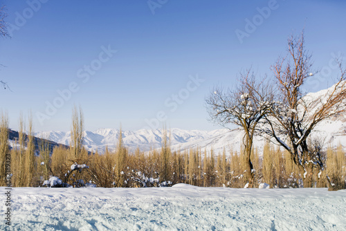 Fototapeta premium Trees growing in the mountains in winter near Chimgan in Uzbekistan