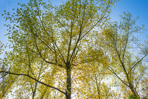 © Naj, Obraz premium Trees in a forest under a blue sky in bright sunlight in springtime, Almere, Flevoland, The Netherlands, May 7, 2022