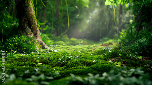 Obraz premium Trees in a forest with mossy ground and vines. A forest during a heavy rain in backlight