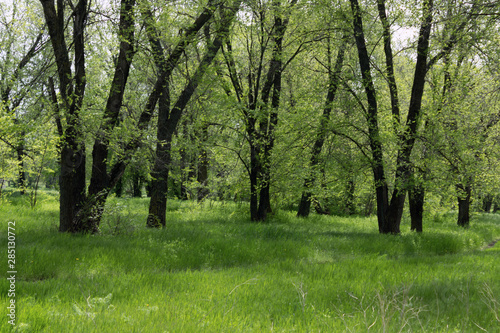 © Aleksandr_Villou, Fototapeta premium Trees in a forest with young leaves in the spring sun