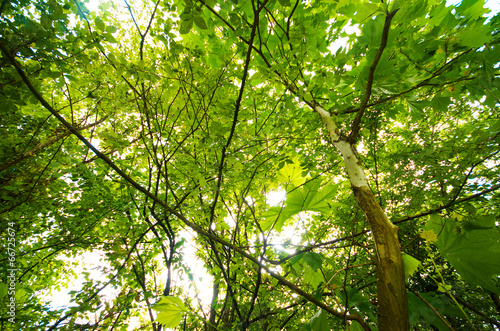 © colomboriccardo, Obraz premium Trees in a green forest seen from below