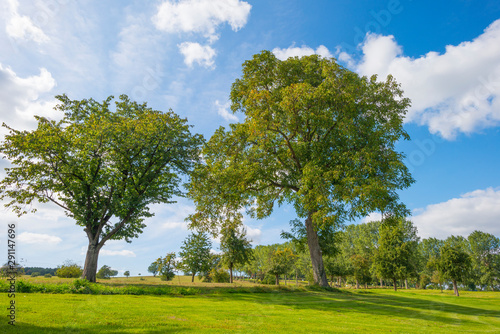 © Naj, Obraz premium Trees in a meadow on a hill below a blue sky in sunlight in autumn