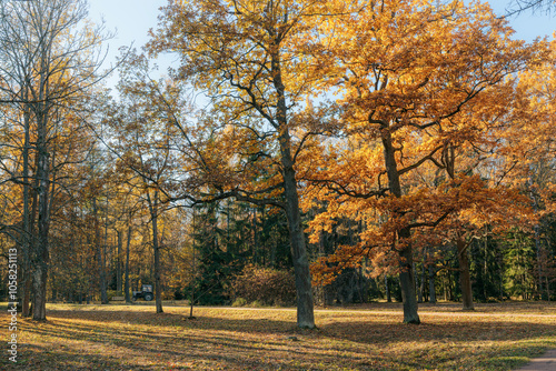 Fototapeta premium Trees in an autumn park bathed in bright sunlight on a clear day, showcasing...