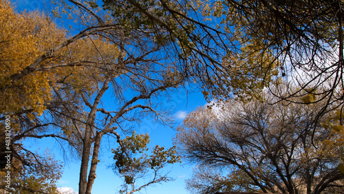 © intricateflow, Fototapeta premium Trees in fall season against the blue sky